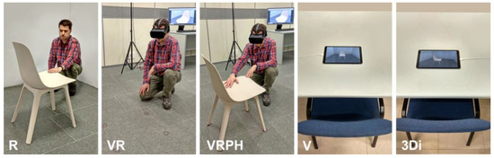 In order to check our hypotheses, an experiment was designed in which each participant viewed and interacted with the same product, which was presented by five different means: real setting (R), virtual reality (VR), virtual reality with passive haptics (VRPH), non-interactive 3D animation in a looped video (V), and 360-degree rotatable image or interactive 3D image (3Di). Two allowed the product to be touched (R, VRPH), and three did not (VR, V, 3Di). The order of viewing sequence was alternated to balance any possible resulting effects.