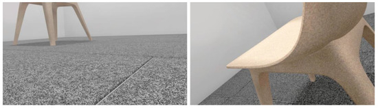 - Room 2 (VR). The chair and Room 1 setting were modelled and rendered with the same details, textures, and lighting. It was presented in VR. The participants could move around the chair, but not touch it or sit on it because there was no physical chair in this room.