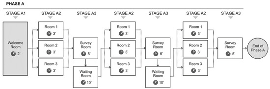 The experiment was performed in two phases. In Phase A (Figure 3) the participants worked with Rooms 1, 2, and 3 in alternating orders (1-2-3; 1-3-2; 2-1-3; 2-3-1; 3-1-2; 3-2-1). Phase B took place 10 months after Phase A. In Phase B (Figure 4), they worked with Rooms 4 and 5, also in alternating orders (4-5; 5-4). At the end, each participant had been in all 5 Rooms. The written protocol helped the researchers to always address the participants in the same way.
