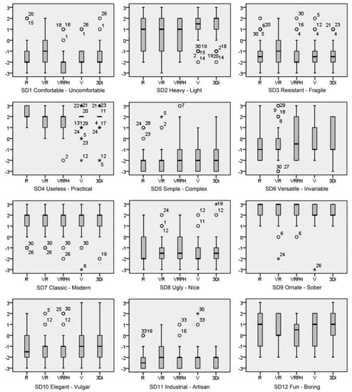Friedman’s test showed that statistically significant differences appeared in the evaluations made for the semantic differential scales SDI (Comfortable–Uncomfortable) and SD2 (Heavy–Light). This revealed that the comfort and weight characteristics can be perceived differently depending on the means selected to present the product. Thus, we can state that H1 is met. Former works have also concluded that presentation means and differences in stimuli can have a certain influence on the evaluation of some product characteristics, which reinforces our thesis. Artacho-Ramírez et al. [54] compared the presentations of loudspeakers by four different means (photography, static infographic image, 3D navigable model, 3D navigable stereographic model) and found differences in the evaluations of three characteristics. Similarly, in [49], Rojas et al. presented bottles using two different visual stimuli (a real image and a virtually simulated image) and found significant differences in 4 of the 15 tested characteristics.