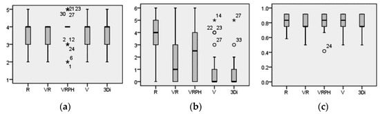 Regarding the sense of presence, the descriptive statistics and box plot are shown in Table 3 and Figure 6b. A statistically significant difference appeared between the experimental conditions when Friedman’s test was applied: Χ2(4) = 40.59, p < 0.001. Conover post hoc tests were used for the pairwise comparison and showed a significant difference between the R vs. VR, R vs. V, R vs. 3Di, VR vs. 3Di, VRPH vs. V, and VRPH vs. 3Di conditions. The adjusted significance levels in Table 6 were calculated by Bonferroni correction.