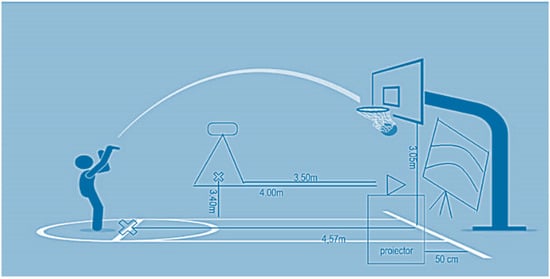 How to execute the subject: the subject is set at a distance of 4.57 m from the edge of the board where the free-throw line is located. The height of the panel is at a distance of 3.05 m from the floor of the hall. The camera is positioned to the side of the subject at a distance of 3.50 m from the first leg and 4.00 m from the second leg of the panel baseline. The camera is 3.40 m from the side-line of the 3-s box. The projector is placed 50 cm from the baseline of the panel, below the projection of the lower edge of the panel. The image is transposed in real-time onto a projection panel, which is placed on the wall below the basketball hoop, respecting the size of the panel (h − 1.05 m × W − 1.80 m) (Figure 1). The original note of the invention is provided by the presence of the visual stimulus in the training process, a stimulus which confers and imposes on the performer the optimal execution pattern of the technical process (Figure 2).