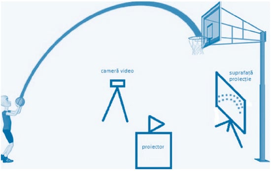 The proposed invention has the following advantages: large area of applicability, time saving in the motor learning process, possibility to present the trajectory in slow-motion or repeat video, ease of use, low cost, and projection to scale, depending on the space that is available and/or the subject’s preference. The system and the device detecting the ideal trajectory of the ball are provided by a 100 Hz high-speed video camera which captures the images and projects them in real-time onto a projection surface that is placed in front of or to the side of the athlete, depending on the subject’s preference, provided that this projection surface is in the performer’s field of vision. System materials: HDMI-HDMI cable, Go Pro Hero 8 camera, tripod, 25 m extension cord, HP laptop, video projector, and a power cable. The Go Pro Hero 8 camera has the following specifications: 12 mpx sensor resolution; 2 inch screen size; HD, Full HD, and UHD 4K video resolution; 60 FPS resolution; as well as Wi-Fi and Bluetooth connectivity. Determining the ideal trajectory consists of video recording the subject’s successful throws (5–10 executions), analyzing their kinematics, determining the optimal trajectory by replaying or possibly overlapping them, and projecting/presenting the trajectory on a projection surface. The presentation of the optimal trajectory will be done with the help of a writing instrument, preferably a marker or colored pencil, provided that the markings on the projection surface (usually paper) are visible and in chromatic contrast (Figure 1 and Figure 2).