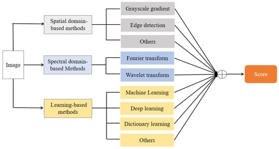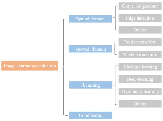 The sharpness evaluation methods for no-reference images can be divided into four categories: spatial domain methods, spectral domain methods, learning methods and combination methods. The specific classification is shown in Figure 1.
