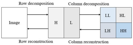 The wavelet transform method can obtain the evaluation results by using the localization characteristics of the image, and its process is shown in Figure 5, which is more suitable for the global or local evaluation of the image. In Figure 5, H and L represent the high-pass filter and the low-pass filter, respectively. The high-pass filter and the low-pass filter are used to extract edge features and image approximation, respectively.