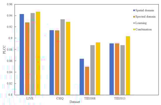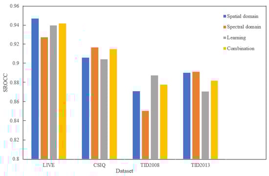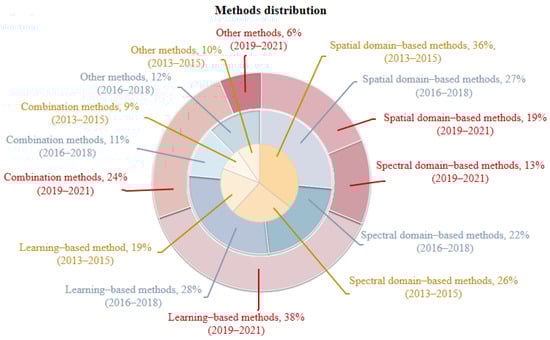 By analyzing Figure 8, during 2013–2015, the spatial domain-based methods were the most with a percentage of 36, followed by the spectral domain-based methods, while the learning-based methods are only 19% of the total articles. In the following years, the learning-based methods grew rapidly, most possibly owing to the explosion of deep learning techniques. During 2016–2018, the number of methods based on spatial domain and learning was similar, 27% and 28%, respectively. From 2019 to 2021, the majority of the research in image quality evaluation is based on learning, and combination methods also show great potential with a percentage of 24. The learning-based methods are currently the most widely used methods due to their excellent behavior for extracting features automatically. The statistical data related information in our paper comes from Web of Science.