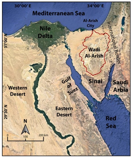 The Wadi Al-Arish catchment is in northern Egypt and covers most of the Sinai Peninsula. It flows northward to the Mediterranean Sea (Figure 1). The mouth of Wadi Al-Arish is occupied by Al-Arish City. The Wadi Al-Arish catchment is located between 29°00′ and 31°00′ N and 33°05′ and 34°45′ E, covers ~23,300 km², and occupies ~36% of the total area of the Sinai Peninsula. Mostly, water tributaries come from Sinai (~91%) and a few drain from the neighboring El-Naqb Desert [15,16,17]. Wadi Al-Arish drains the central highlands of the Peninsula and its upstream courses come from El-Egma and El-Teeh plateaus [16].