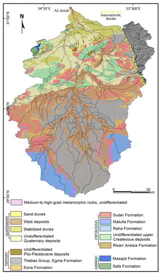 The geology of the Sinai Peninsula has been investigated, defined, and mapped by many researchers [18,19,20,21]. The local lithology of Wadi Al-Arish has been remapped based on previous works and geological maps of Egypt prepared by Conoco and General Petroleum Corporation of Egypt [18] (Figure 2). The oldest exposed surface lithology in Wadi Al-Arish belongs to the Jurassic age, represented by Safa and Masajid Formations and made up of coal-bearing continental clastics with some marine carbonates with a few fossils, and marine shelf limestone with shale intercalations at the base. The Lower Cretaceous age is represented by the Risan’ Aneiza Formation, which is composed of basal sandstone and conglomerate overlain by interbedded clastic and carbonate. The Upper Cretaceous is represented from the oldest to the youngest by undifferentiated deposits; the Raha Formation, Matulla Formation, and Suder Formation, respectively. The basal unit of the Upper Cretaceous is made up of clastic and biogenetic carbonate comprising Raha, Wata, Matulla, Qusier, and Duwi Formations. The Raha Formation consists of fossiliferous limestone with shale intercalations and ouster beds. The Matulla Formation consists of marine sandstone, marl, and shale. The Suder Formation was recognized as the youngest lithology of the Upper Cretaceous age, and consists of uniform marine chalk with thin shale intercalations. In Wadi Al-Arish, the Tertiary is represented by three units. They are arranged from base to top as the Esna Formation, which is composed of greenish-grey open marine shale, the Thebes Group (Egma Formation) that consists of bedded marine chalky limestone with a chert band, and the Plio-Pleistocene deposits comprising the Shagara and Marsa Alam Formations. The Quaternary deposits of the Wadi Al-Arish are represented by undifferentiated Quaternary deposits, stabilized dunes, wadi deposits, and sand dunes from the base to top, respectively. Figure 2 illustrates the geology of the entire study area.