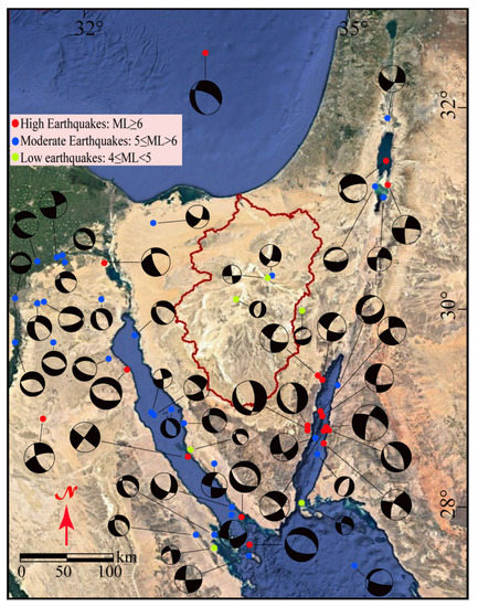Historical and instrumental seismicity of the Sinai Peninsula have been investigated by many researchers [22,23,24,25,26,27]. Twenty-five seismic events have been reported between 95 BC and 1910 AD at various localities with different intensities [28]. The reported intensities were based on recorded damage, which indicates heterogeneous behavior in space or time (Figure 3). Instrumentally, earthquakes have been reported in Egypt since 1903, and seismographs have been used since 1962 by the installing an observation station in the Helwan area, south of Cairo [24]. In the Sinai Peninsula, signals of earthquakes were recorded from 1900 to 1997 from a number of seismological stations. The main earthquakes of Sinai and surrounding areas are illustrated in Figure 3.