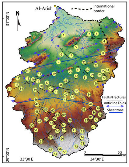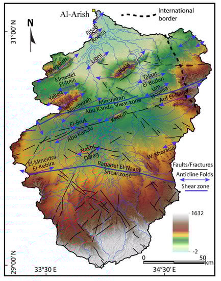 Shaded relief image (data from SRTM-30 resolution) of Wadi Al-Arish showing fractures, folds, and shear zones; modified after [18]. Blue hollow polygons indicate the classified catchments/sub-catchments of the study area.