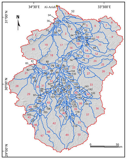 Shaded relief image (data from SRTM-30 resolution) of Wadi Al-Arish showing catchments/sub-catchments. Red numbers indicate catchments (1–51); black numbers indicate sub-catchments (52–146).