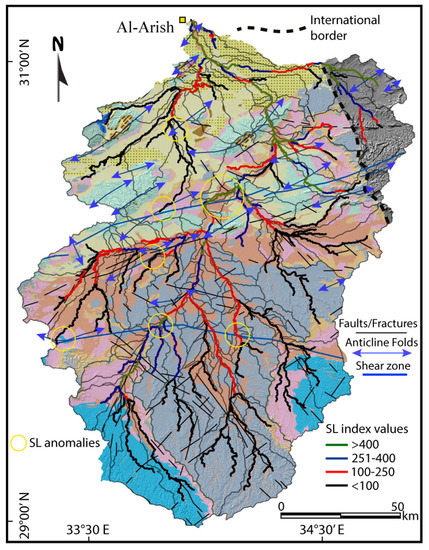 In this study, we observed that nearly all the lithology of the study area shows the same level of rock resistance [1,5,7]. Therefore, we assume that the role of rock strength is negligible and that anomalies are related tectonic signatures. The SL index showed many tectonic anomalies, particularly along the channels running over shear zones in the middle part of the study area. Anomalies were observed due to high values over tectonic elements and low values over active spots (Figure 6). Values of the SL index had variable distribution over the whole study area. The highest and most anomalous values were observed along the Minsherah Abu Kandu shear zone in the middle zone of the proposed area. Various spots over the southern part of the study area had anomalously low SL index values over various trending fractures (Figure 6). In the northern part, the lowest values of the SL index, which were anomalously low for the area, occurred where the streams crossed the Libni anticline fold. Along the southern portion of the study area, the SL index tended to have relatively low values. An anomalous value of this index over a river parallel to Regabet El-Naam shear zone was recorded due high values over a stream running over a shear zone (Figure 6). Over the middle area, between the Minsherah Abu Kandu and Regabet El-Naam shear zones, the values of the SL index were mainly low. A few higher SL index values were related to tectonic signals. Along the Abu Kandu anticline fold, the SL index had anomalously low values crossing the fold.