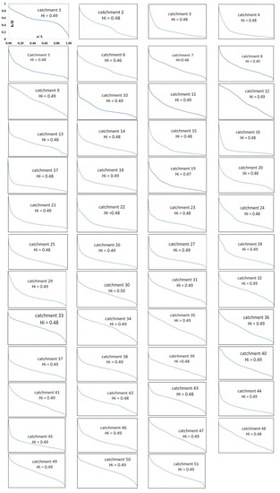 We investigated Hi values and Hi curves. The Hi integral index values were between 0.30 in sub-catchment 57 and 0.51 in sub-catchments 56, 69, 94, 97. Our hypsometric analysis showed some concave curves associated with values of 0.48 and 0.49 (results of hypsometric curves are illustrated in Figure 7). Obtaining elevation values from digital elevation models are necessary for computation of this index. The hypsometric integral values do not relate directly to relative tectonic activity [6]. The value of this index is generally affected by rock strength as well as some other parameters. High values of the Hi index generally suggest a younger landscape that may developed by active tectonic events [7] (Figure 7). High Hi values may also result from very recent incisions into a young surface resulting from deposition processes. The authors of [6,7,9] assumed that convex lower part curves may indicate uplift signals along an active fault, or uplifting signals resulting from recent folding events. They also stated that Hi values greater than 0.5 result in convex curves. Values descending from 0.5 to 0.4 indicate convex-concave or semi straight curves, and values less than 0.4 are described by concave shapes (Figure 7). The hypsometric integral index values were analyzed based on the utilization of all catchments/sub-catchments of greater than the fourth drainage network order. Results for the hypsometric index are presented on Table S1 in the Supplementary data.