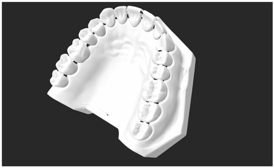For evaluation, a reference model made of Duroplastic™ containing 16 maxillary permanent molars (Frasaco™ Gmbh, Tettnang, Germany) was chosen. A GOM ATOS Capsule (Zeiss™ Gmbh, Braunschweig, Germany) was used to digitize the model. The scanning process required uncoded markers to align each exposure to the previous ones and create a 3D point cloud. According to the manufacturer, this device can measure the reference markers with a deviation of 3 µm to 5 µm. The result of the scan was a 3D polygon-mesh (Figure 1).