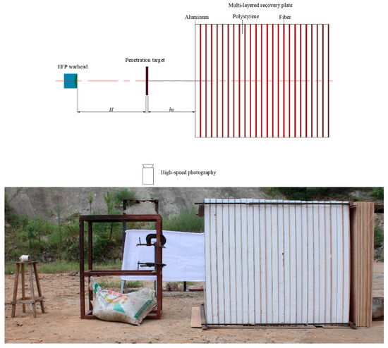 Similar to previous studies [18,33], the fragments were recovered using multi-layered witness plates consisting of a stacked polystyrene foam plate (EPS, density 20 kg/m3) and fiber plate. The test setup is shown in Figure 3. The 9 mm-thick fiber plates gradually weaken the energy of the fragments, and each plate was separated by a 50 mm-thick piece of EPS to provide space for fragment scattering. The remaining positions of the fragments were collected to analyze the spatial distribution. Only the fiber plates were placed at the end to capture the residual projectile because its energy was too large. An aluminum witness plate with a thickness of 2 mm was used as the first layer to obtain the contour of the perforation. The distance h0 between the penetration target and the witness plate was 500 mm. The size of the recovery plates was 1.2 m × 1.2 m to ensure that the witness plate could capture as much information about BAD as possible. The three types of EFPs then penetrated vertically into 20 mm-thick #45 steel targets at the same standoff. Two repeatability tests were carried out for each EFP to consider the randomness of the formation and the scattering of the BAD.