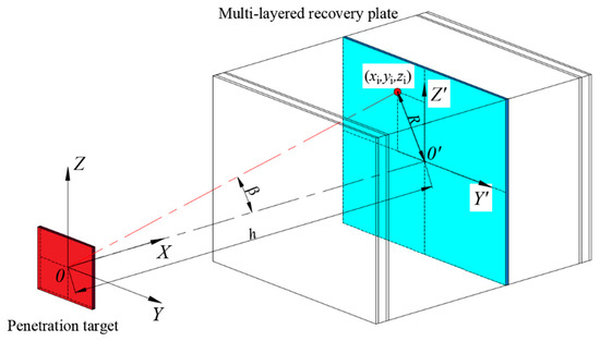 The coordinate system shown in Figure 5 was established to characterize the striking area behind the target. The x axis is the incident direction of the EFP, the y axis is the transverse direction, the Z axis is the longitudinal direction, and the exit on the back of the steel target was the origin O. The positions where the fragments were embedded on each layer of the recovery plate were collected, namely, the positions where the fragments impact the recovery plate of this layer. Additionally, we calculated the coordinates of each fragment relative to the residual EFP perforation center O’ in the local coordinate system Y’O’Z’ of the witness plate. In turn, the spatial coordinates (xi, yi, zi) of each fragment were obtained.