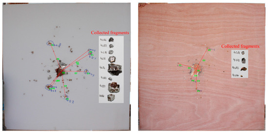 The fragments collected in each recovery plate were numbered. For example, Figure 6 also shows the fragments embedded in this layer of witness plate. Additionally, the he numbers next to each fragment indicate the number of the fiber plate or foam plate and the position of the fragment, which correspond to the position on the recovery plate in Figure 6. Thus, the relation between the mass and spatial coordinates of the fragments could be established.