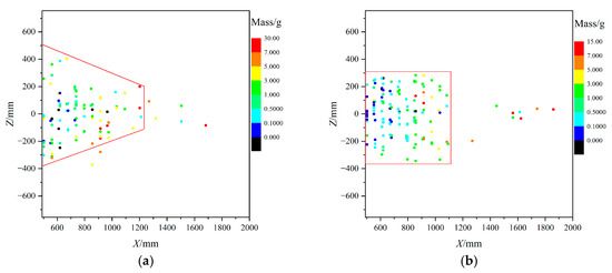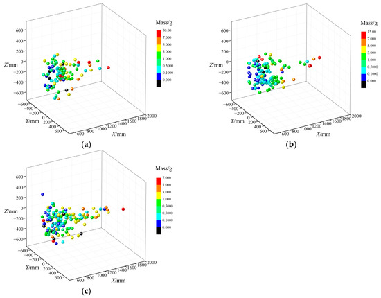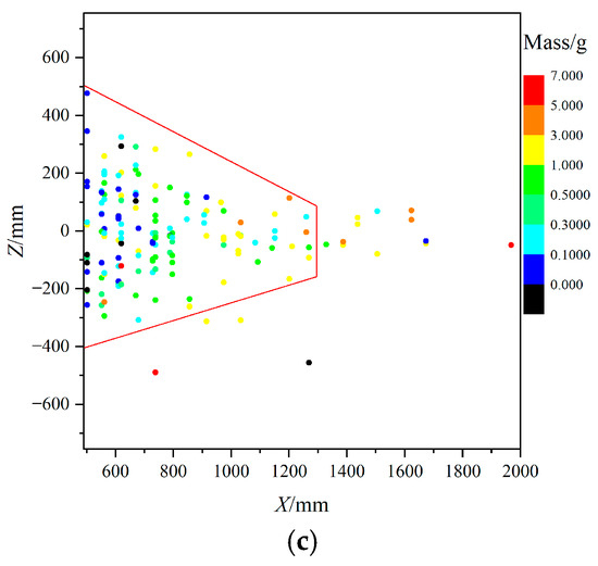 The EFP material (copper) fragments and target material (steel) fragments were then separated for further research. Figure 8 shows that there are many fragments with a mass less than 0.1 g. Considering their small lethality, only the positions of fragments greater than 0.1 g were included in the subsequent analysis.