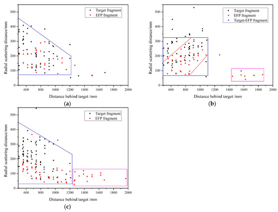 According to the model proposed by Schafer [34], the BAD cloud is described from three aspects. The residual EFP, large fragments of the target plug in the last few layers of recovery plates, and the fragments in the large hole formed by the residual EFP were excluded; statistical analysis of the fragments scattered around the residual EFP was then performed.