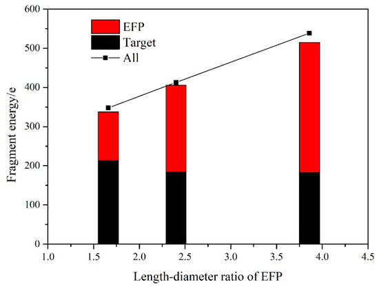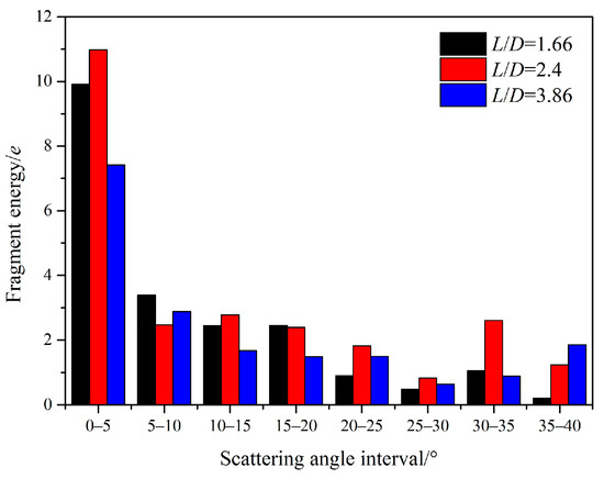 Figure 14 shows that there was only target fragment with energy beyond 25°. The fragments with a large scattering angle were from the ring fragments, i.e., the spall ring formed by the stretching wave due to the reflection of the shock wave on the back surface of the target. Although the velocity of the fragments was low, their mass was quite large [11,19]; therefore, the average energy of the fragments in this section increased instead. With an increasing L/D of EFP, the average energy of the target fragments with a large scattering angle (35–40°) increased because the spall area reflected the energy absorbed by the target from the EFP [37]. The specific kinetic energy increased when the EFP diameter decreased, and the input energy on the target per unit mass increased, resulting in a small fragment mass and a high fragment velocity. Thus, the average energy of fragments in this region increased.