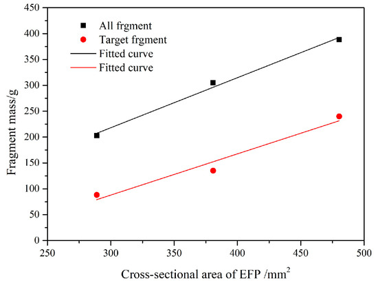 Figure 10 shows that when the L/D increased from 1.66 to 3.86, the total energy of the all fragments and EFP fragments increased by 54.8% and 167.7%, respectively, whereas the total energy of the target fragments decreased slightly. When the steel target remained the same, the total energy of the target fragments gradually approached a certain level, and the total energy of the EFP fragments increased significantly with increasing L/D. Hence, the proportion of the energy of the EFP fragments increased from 35.6% to 61.6%. According to the experimental results, the total mass of the BAD (>0.1 g) of the three types of EFPs was 388.37 g, 304.93 g, and 202.93 g, respectively, of which the total mass of the target fragments was 239.84 g, 135.14 g, and 88.10 g, respectively. The relationship between fragment total mass and EFP cross-sectional area is shown in Figure 11.