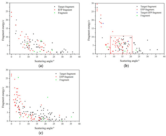 Based on the calculated fragment energy and the spatial position of the fragment, the relationships between the energy of the EFP fragments and target fragments and the scattering angle were obtained, as shown in Figure 12. Additionally, two sets of test data of EFP with the same L/D were accumulated. The green dots mean that no fragments were collected in the corresponding hole of recover plate and that the material of the fragments could not be determined.