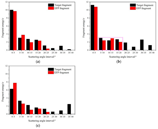 According to the scatter plot of energy distribution, the average energy of all fragments in each scattering angle range was calculated, and the results of two tests of each EFP type were averaged to obtain the average energy distribution of the fragments, as shown in Figure 13.
