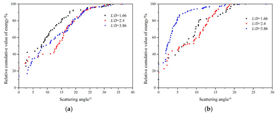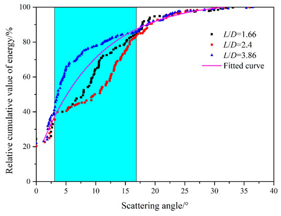Figure 15 shows that the overall rate of increase in the BAD energy gradually decreased with the increasing scattering angle. The differences in the spatial distribution of the BAD energy between the three EFPs were mainly concentrated in the scattering angle range of 3–17°, the distribution of other scattering angle ranges is basically the same. The total energy of the fragments within a scattering angle of 17° accounted for about 85% of the total energy of all fragments, indicating that the energy of the fragments with a large scattering angle was small. In the range of 3–17°, the curve of the EFP with an L/D of 2.4 was the lowest, which reflects the shift of energy distribution towards the large scattering angle. In contrast, the fragment energy of the EFP with an L/D of 3.86 was concentrated in the small scattering angle region. The data in the scattering angle range of the same distribution were fitted in Figure 15, and the spatial distribution of the relative cumulative energy followed an exponential function.