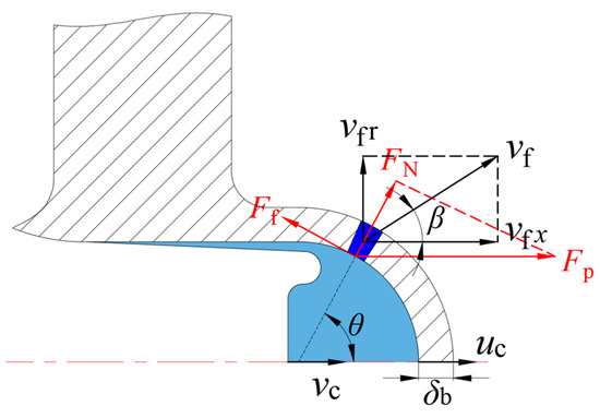 Assuming that the shape of EFP mushroom head and bulge is spherical, then the bulge is completely broken, EFP erosion is complete, and the material in mushroom is no longer in a fluid state. At this time, the residual EFP velocity is usually greater than the target fragment velocity. Because of the velocity difference between the two, friction is generated along the contact surface. At the time of complete rupture, the force of a fragment generated by a fracture on the bulge, as is shown in Figure 17. The forces are expressed as: