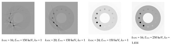 From the analysis of the data shown in Figure 6, we can conclude that the significant reduction in the level of metallic artifacts by increasing the ADC bit depth for Emax = 160 keV is practically unrealizable. The necessary effect is achieved by simultaneously increasing the maximum X-ray energy to 225 keV and the ADC bit depth kADC = 24, kADC = 32. An increase in Emax from 160 keV to 225 keV results in a 26% increase in the absorbed energy in the TO.