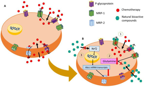 Representative image of modulation of the MDR mechanism of resistance by natural bioactive compounds. (A) Main membrane transporters that are involved in chemoresistance by expelling them into the extracellular medium. (B) Action of natural bioactive compounds in the regulation of MDR by (1) MRP-2 downregulation through the inhibition of the Nrf2/MRP2 pathway, (2) P-glycoprotein and MRP-1 blocking by natural bioactive compounds, and (3) inhibition of glutamine cell intake producing an MRP-1 disfunction.