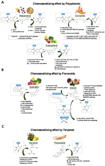 Sensitizing effect on chemotherapeutic drugs that are frequently used in CRC exerted by natural compounds of the following families (A) polyphenols, (B) flavonoids, and (C) terpenes, analyzed in this review. DOXO (doxorubicin); 5-FU (5-fluorouracil); OXA (oxaliplatin).