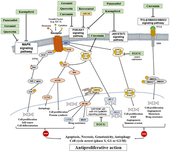Main signaling pathways that were altered after treatment with several of the natural compounds that were analyzed in this review. Most pathways are linked to multidrug resistance processes and their inhibition leads to cell death processes that are induced by apoptosis, necrosis, autophagy, or mediated by genotoxicity.