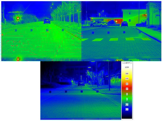 Luminance images of the test roads on which the study was conducted: (top left) test road 1 ( −2, M4 class); (top right) test road 2 ( −2, M5 class); (bottom) test Road 3 ( −2, M6 class). From the luminance images, the homogeneity differences are obvious.