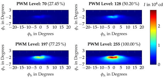A BMW 3 Series was used as the test vehicle for the study. The test vehicle was equipped with standard LED headlights that generate both a low beam and high beam function with LEDs. The headlights of this test vehicle were electronically modified so that they could be varied in intensity via 8-bit PWM coding. Thus, the intensity of the automotive low beam could be varied from switched off to completely switched on. Figure 3 shows the results from goniophotometer measurements of the low beam distribution at different PWM levels. Here, describes the horizontal angle of the light distribution, is the vertical angle of the light distribution, and I denotes the luminous intensity.