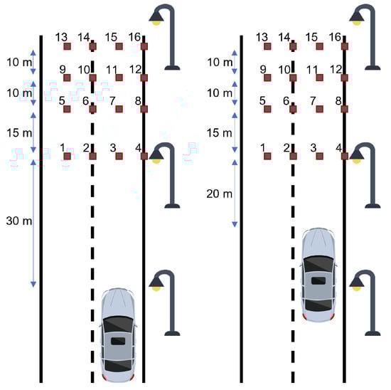 The test subjects arrived at the respective test roads and were allowed time to adapt to the currently prevailing lighting conditions during the study briefing and answering of the personality questionnaire, resulting in an adaptation time of at least 15 minutes before the actual study began. The detection objects, which were 0.2 × m2 flat targets with a reflectance of about 4% (exact value %), were placed on a measurement grid which had four objects per row at distances of 30 , 45 , 55 , and 65 . A low reflectance was chosen because according to studies by Randrup Hansen and Schandel Larsen [65] or Schneider [66], the clothing of pedestrians has low reflectance values of less than 10%, especially in the winter. The reflectance of the flat targets was determined by comparative measurements with a reflectance standard. Furthermore, two different vehicle positions were considered. In the first, the vehicle is placed directly under a street light system, while in the second, the vehicle is moved 10 in the direction of the measurement grid, creating a second situation for the detection of objects with distances of 20 , 35 , 45 , and 55 . The applied measurement grids are shown in Figure 4.