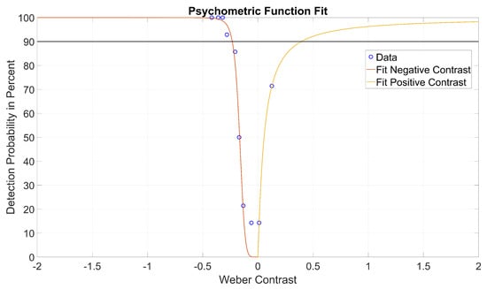 This evaluation methodology provides the advantage that different detection probabilities can be considered even though these probabilities may not be achieved by the headlight system used. An example of data evaluation using the psychometric function according to Linschoten et al. [68] is shown in Figure 5. Here, a psychometric function is fitted to the data with positive as well as with negative contrast; additionally the 90% threshold is plotted, and indicates secure detection.
