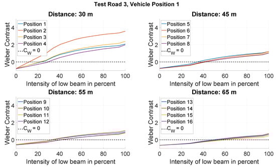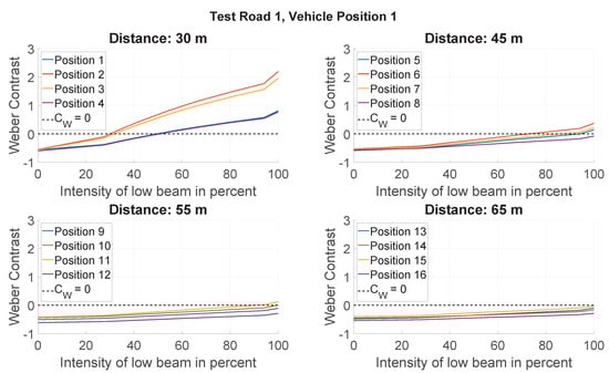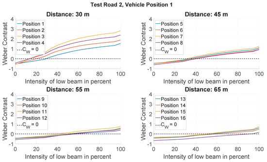 From Figure 6, Figure 7 and Figure 8, it is clear that the low beam intensity has a considerable influence on the value and polarity of the Weber contrast. At all object positions, there is initially a negative contrast between the object and its background created by the existing street lighting. If the low beam intensity is increased, a transition point from the negative contrast to the positive contrast is reached in the majority of the object positions considered on the three test roads, in which the negative contrast generated by the street lighting and the positive contrast generated by the vehicle low beam neutralize each other and no more contrast can be perceived between the object and its background. In this case, the detection object is no longer visible, and disappears for the driver. It is noticeable that the intensity of the low beam has to be increased to different extents depending on the distance and the object position in order to reach this transition point.