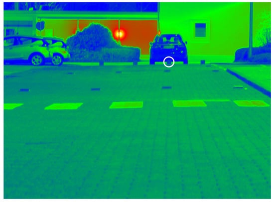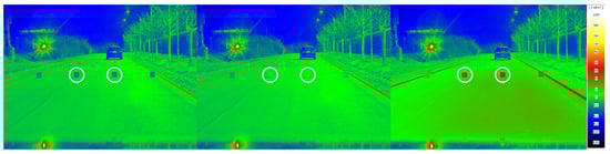 The pictures of the test roads shown in Figure 1 serve as an overview of the test roads and the test setup. Photometric analysis of the test roads was performed using luminance images, which are shown schematically in Figure 2. The average roadway luminance varies from −2 for test road 1 to −2 for test road 2 and −2 for test road 3; see Figure 2. From the luminance images, the differences in the homogeneity of the street lighting are evident, as are the different roadway brightnesses. The luminance recordings were carried out with a luminance camera (TechnoTeam LMK 5 color) attached to the rearview mirror of the test vehicle in order to realize the measurement from the driver’s point of view.