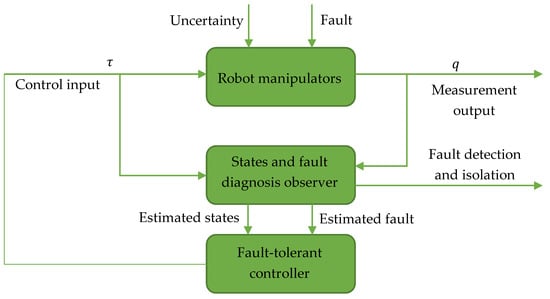 In [36], a fault-tolerant control system in the form of a super-twisting third-order sliding-mode (STW-TOSM) observer and a super-twisting second-order sliding mode (STW-SOSM) controller was presented. This method makes it possible to estimate errors and uncertainties without measuring the speed of the robot’s members. For the correct operation of the system, only position measurements are needed. In the paper, the authors presented a comparison of the following systems: the traditional computed torque controller (CTC) [37], the active CTC-FTC controller [38], the passive SM-FTC [39] controller, and the proposed STW-SOSM-FTC controller in both passive and active forms. The test of the proposed controller showed fewer errors, better stability, and no vibrations on the obtained output waveforms. A block diagram of the arrangement of each block in the control process is presented in Figure 6.