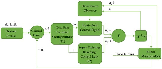 The authors of [47] presented a combination of a fast terminal sliding-mode surface (FTSMS), super-twisted reaching control law (STRCL), and disturbance observer (DO). The proposed method was compared with the SMC and NFTSMC methods. The method described in the paper provided convergence in finite time and effectively combatted the chattering phenomenon. By using a disturbance observer, the complexity of the calculations was reduced. A DO was also used to estimate uncertainties in the form of dynamics, external disturbances, and failures. A diagram of the proposed method is shown in Figure 7. This work presents the new fast terminal sliding surface described by the formula in [47]: