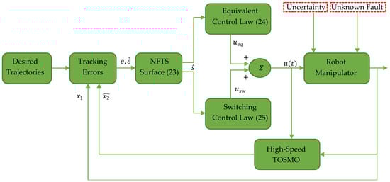 The authors of [49] presented a fault-tolerant manipulator control strategy in the form of a combination of NFTSMC and the proposed high-speed third-order sliding-mode observer TOSMO. This combination was able to handle unknown input data, further reducing the vibration phenomenon and improving the accuracy of trajectory tracking. The proposed high-speed TOSMO could estimate both the velocity signal and input data faster than a standard TOSMO. The structure of such a system is similar to that of the FTSMS-STRCL-DO [47] but it has a different observer model. The structure of the proposed method is shown in Figure 8. The solution proposed by the authors is described by the following formulas [49]: