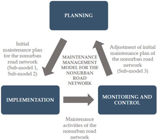 Considering all the above, the management processes of planning, implementation and maintenance monitoring and control must be interconnected and inseparable. Therefore, the main goal of this research is to present an approach to the maintenance management of nonurban roads for which the sustainability stems precisely from the interconnectedness of the fundamental management processes into a single entity realized by establishing a few sub-models based on a unique combination of selected methods of multi-criteria analysis and earned value analysis, which reflects the original contribution of this research. A proposed approach to managing the maintenance of the road network outside urban areas is presented below.