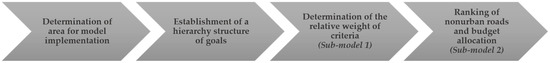 The output of the management planning process is the initial maintenance plan for the nonurban road network, which further serves as an input for the management process of implementing when certain maintenance activities are carried out on observed nonurban roads. As such, the management process of planning within the presented model consists of four steps, namely, the determination of the area for model implementation, the establishment of a hierarchical structure of goals, the determination of the relative weight of the criteria and the ranking of nonurban roads and the distribution of financial resources according to the maintenance priorities (Figure 2).