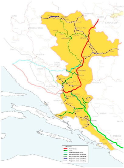 - Ministry of Transport and Communications. Development Strategy of Public Rods in the Herzegovina-Neretva County for Period 2020–2030; Ministry of Transport and Communications: Mostar, Bosnia and Herzegovina, 2020. [Google Scholar]