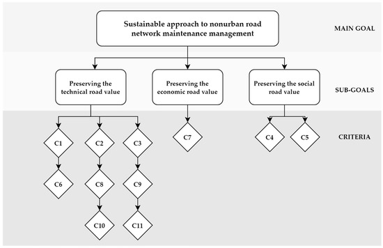 The hierarchical structure of goals in this research is defined by a sustainable approach to nonurban road network maintenance as a main goal. According to compromise solution of all stakeholders involved in the decision-making process, the first level of objectives contains preserving technical road value, i.e., maximization of technical road characteristics, preserving the economic road value as maximization of economic indicators and preserving the social road value as maximization of social benefits. The last level in the presented hierarchy structure of goals (HSG) represents criteria which are used for multicriteria analysis. Preservation of the road’s technical value is divided into eight technical criteria (C1, C2, C3, C6, C8, C9, C10, and C11), three of which affect the ecological aspect of maintenance, such as traffic intensity (C1), length (C2) and width of the nonurban road (C9). Preservation of the economic road value is expressed through maintenance cost as economic criteria (C7). Finally, preserving the social road value is divided into two social criteria (C4 and C5). The mentioned criteria are included in the hierarchical structure of goals as indicators of the state of nonurban roads that could be measured on the ground at the time of the research. The described hierarchical structure of the goals is shown in Figure 4 and the criteria, with a description of the criteria, are given in Table 1.
