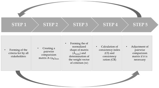 In the first step of the presented sub-model, it is necessary to form a list of criteria from the hierarchical structure of goals, with which involved stakeholders will compare the criteria with each other using the fundamental scale [25,26] and forming a comparison matrix A = (ajk)nxn where n presents the number of considered evaluation criteria. Each element of matrix ajk presents the importance of the jth criterion in relation to the kth criterion. After that, in the following step, it is necessary to form the normalized shape of matrix (Bnorm), where each element is computed as:
