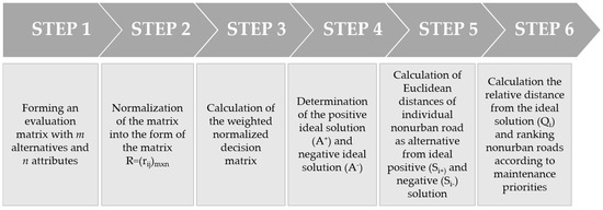 The sub-model for priority ranking of nonurban roads uses the output results of the previously described sub-model for determining the relative weight of criteria. This sub-model is based on the application of the TOPSIS multicriteria decision-making method [28,29] and, according to Figure 6, it is divided into a total of six steps: