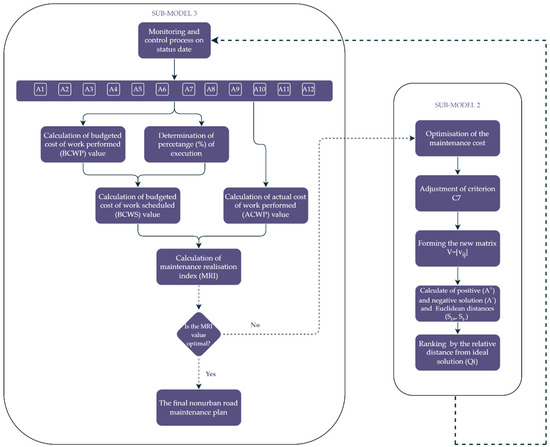 Based on the new maintenance cost (NMC), an evaluation matrix with m alternatives and n attributes is formed again, after which all other steps of Sub-model 2, shown in Figure 5, are carried out, ranking again only the critical nonurban roads, while the remaining nonurban roads whose MRI value was previously optimal do not enter in this iterative process. Therefore, the continuous relationship between sub-model for maintenance monitoring and control for nonurban road network (Sub-model 3) and sub-model for priority ranking of nonurban roads (Sub-model 2) is shown in Figure 8.