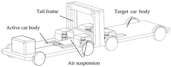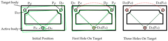 In the process of double car docking, the target car body is tracked by the active car body based on the visual positioning system, using the “three−point circle peripheral ring cone” space docking technology to complete the posture adjustment and weak collision docking process. The space docking frame model is shown in Figure 2. The active and passive car bodies are the same in appearance and space dimensions, but the difference is in the docking part. Three holes are arranged on the rear frame of the active and passive car body. The three holes of the active car are called fine pupil Dr1, Dr2, and Dr3, as shown in the green part of Figure 3. And the three holes of the passive car are called lock body Pa1, Pa2, and Pa3. The top left and right hole positions Dr2 and Dr3 (or Pa2 and Pa3) take the bottom hole position Dr1 (Pa1) as the center, as shown in the red line of Figure 3. The docking process is shown in Figure 3. With the help of vision, the driven car’s circle center of lock body Pa1 is looked for by the driving car’s circle center of fine pupil Dr1. When they are aligned, the lock tongue is triggered to be inserted deep into lock body Pa1, adjusting the position and posture through the suspension of the active vehicle (Figure 4). Then, the top two fine pupils (Dr2 and Dr3) rotate with the center to find the corresponding lock body hole (Pa2 and Pa3) and trigger the lock tongue after aligning with the magnetic suction mechanism. The three holes are locked at the same time to complete the butt joint.